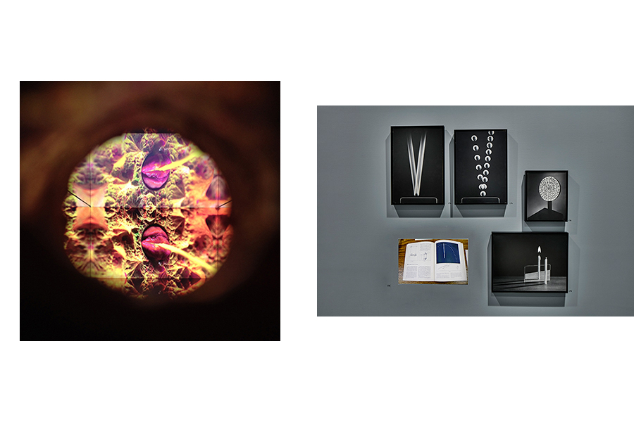Jill Magid’s sculpture investigates the legal parameters of the architect Luis Barragan’s legacy. A parallel is drawn to Abbott’s work on the legacy of Atget, represented in the exhibition by an article, a book, and portraits of Atget. Matt Keegan’s steel sculpture is powder coated in the “federal blue” color of New York City’s Hells Gate Bridge; Abbott’s black-and-white photographs capture the steel cables and girders of the Manhattan, Queensboro, and Brooklyn bridges. Three hanging sculptures by Erika Vogt magnify the various textures of a repeating form, as six of Abbott’s Super Sight photographs show the contrasting details of her macrophotography. A. L. Steiner’s photocollage assembles intimate moments with friends and lovers, while Abbott’s portraits are solitary stagings taken in her studio. Water acts as camera and lens for both Katherine Hubbard’s ice photograms and Abbott’s water-ripple photograms. Lucy Raven’s stop-frame animation deconstructs the mechanisms of the 3-D film industry. Abbott’s patents and sketches reveal the numerous inventions she designed for the photography industry. Fia Backström’s composite essay On the Photographic—the Growth and Its Perennials performs a dialogue between her text and images, while a framed draft of Abbott’s 1946 “Statement in Regard to Photography Today” is flanked by two of her photographs. Mika Rottenberg’s video choreographs the physics of moving bodies in a projection embedded within the wall, and Abbott’s photographs for the Physical Science Study Committee are compiled into a slide show. As MPA’s aerial photographs of Peru’s Nazca Lines geoglyphs capture the unresolved mystery of this cosmic phenomenon, a set of Abbott’s astrology charts reveal her personal curiosity about the impact of interplanetary forces on her own life.